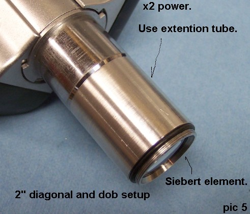 After the sleeve you then thread your barlow, Burgess/WO on to the end for x3. This setup is for Dobs and refractors alike and will likely work in a 2" diagonal just as well as a 1.25" diagonal. You will need to use a 2" to 1.25" step down adapter in 2" diagonals. You may also remove the parfocal ring that I accidentally left on the Burgess nosepiece in the picture. 5 In the picture below are some precautions that should be taken with a 2" diagonal.
