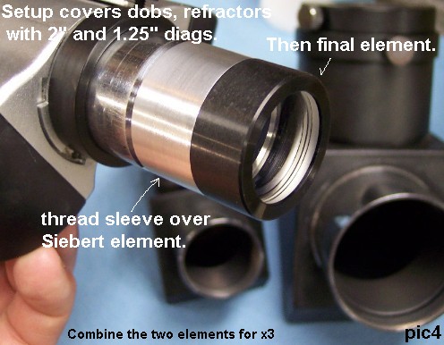 This combines the Burgess or WO barlow with a Siebert Optics Element to allow for a combination of magnifications as illustrated below. Read the the information below for complete details. The lowest power for refractors is 1.6x and dobs x2. Check details below 1.